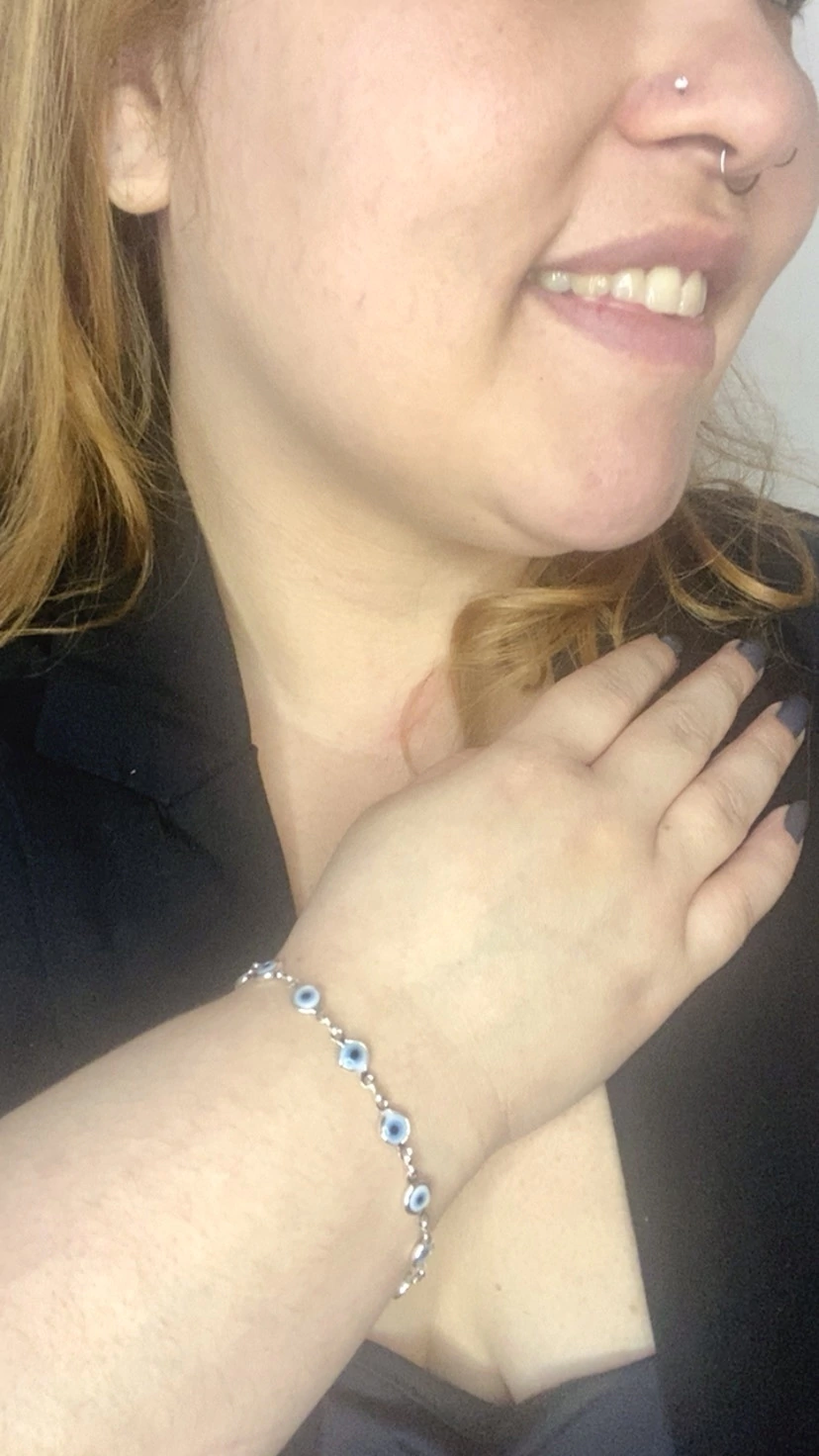 Além de um acessório moderno e cheio de personalidade, esta pulseira é um amuleto de proteção que pode acompanhar você em todas as ocasiões. Seu design delicado e o acabamento banhado a prata fazem dela uma peça versátil, que combina com looks casuais e mais sofisticados.